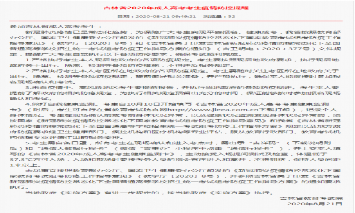 通知:吉林省2020年全国成人高校招生统一考试时间确定,请各位考生提前做好防疫工作统计,特此通知。